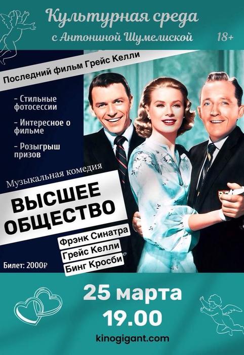 Клуб «Культурная среда» с Антониной Шумелиской» приглашает вас на кинопоказ фильма «Высшее общество».Искромётная музыкальная комедия для тех, кто хочет окунуться в беззаботную атмосферу высшего общества в компании легенд Голливуда — Бинга Кросби, Грейс Келли и Фрэнка Синатры.